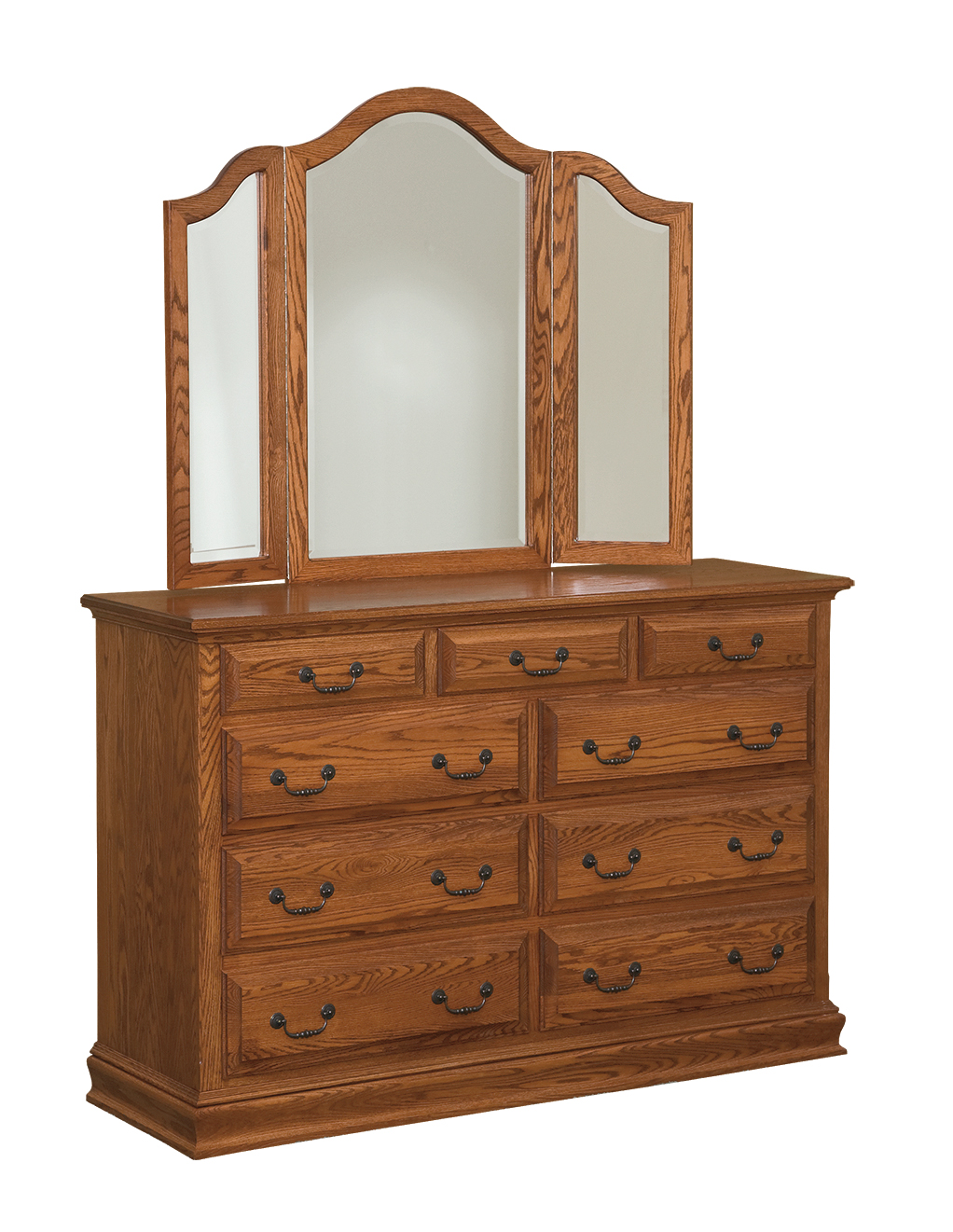 Eden Style Tri-Fold Mirror in Oak, Cherry or Maple. Shown with Eden Style 7 Drawer Dresser.