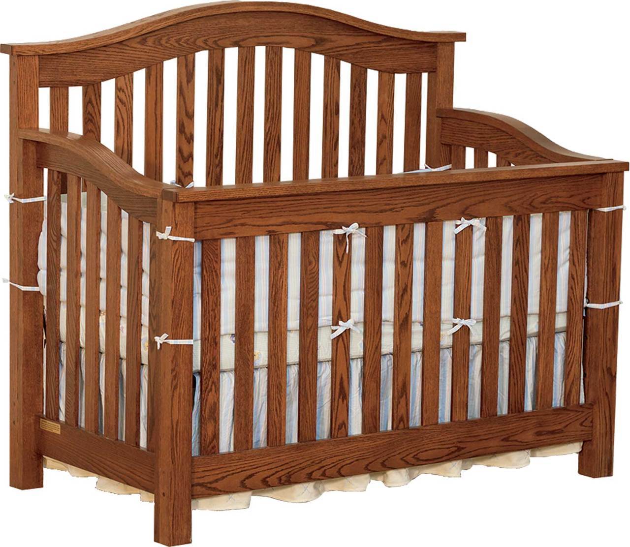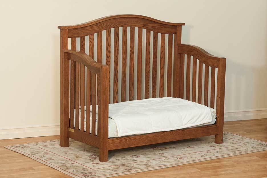 Mission Arched Crib Package Kit. Includes Mission Arched Crib, Toddler Bed/Day Bed conversion kit & full bedrails and slats. Available in Oak, Maple, Cherry